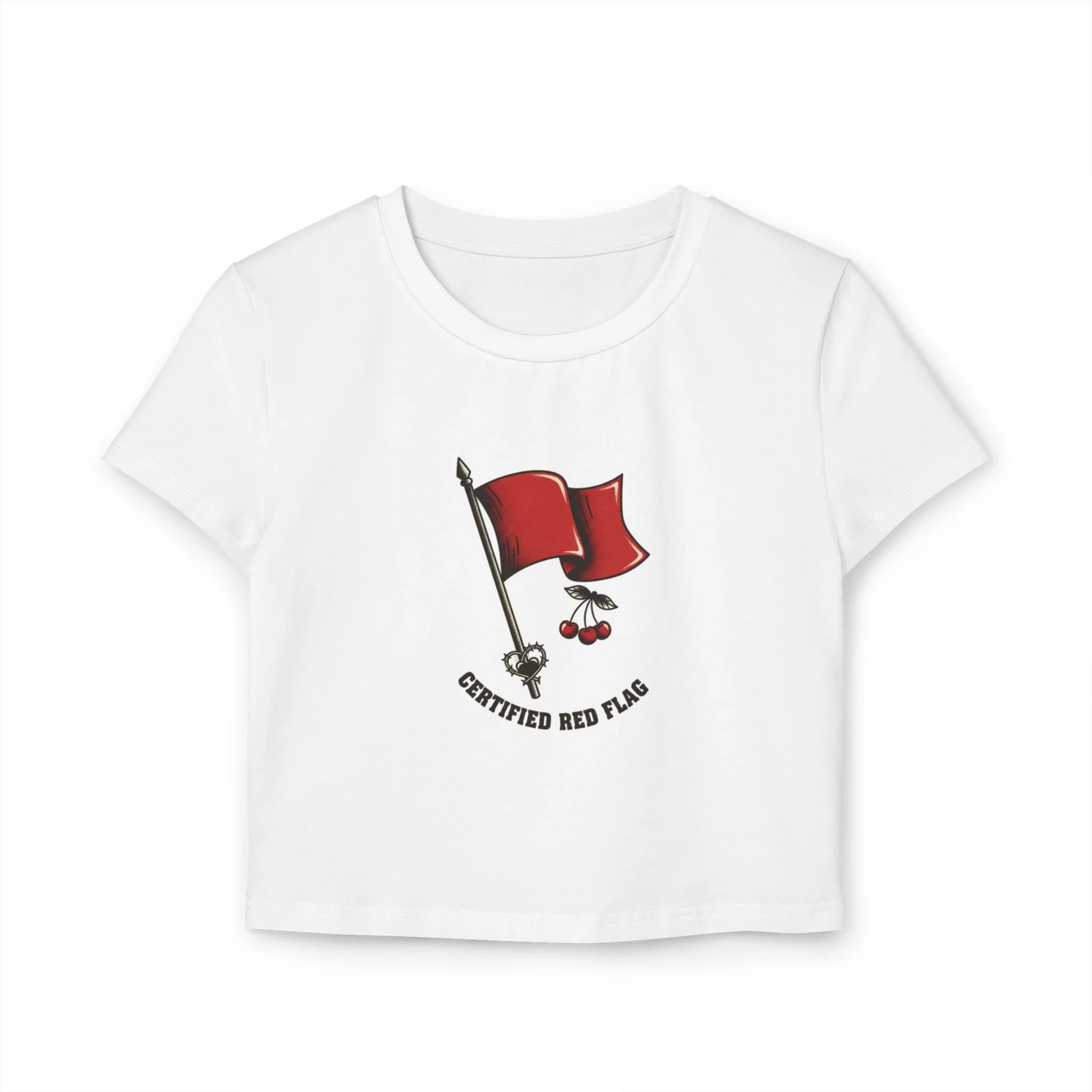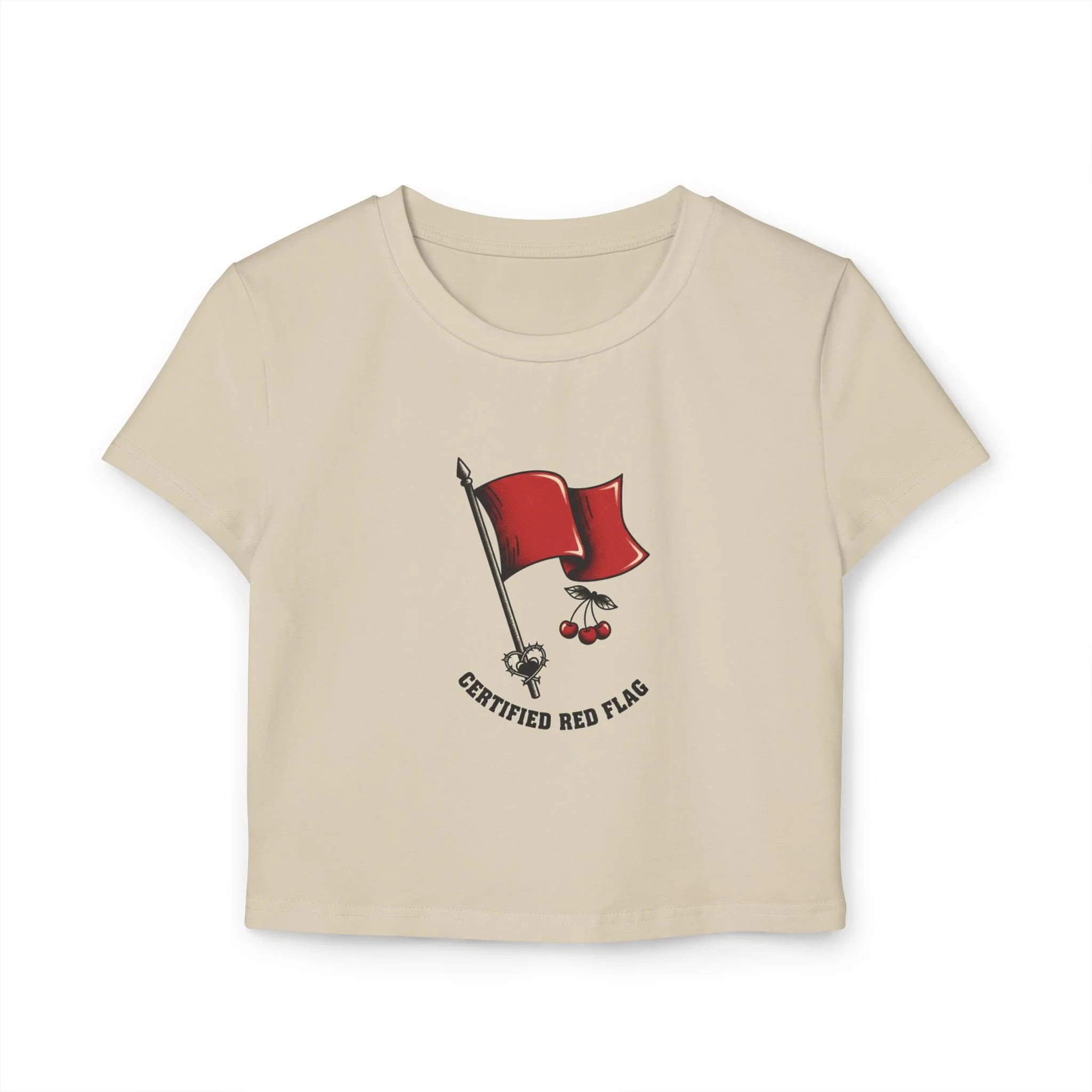 RoomService › Baby Tee — Red Flag Cherry Graphic Crop Top Image 1 of 4 Image 2 of 4 Image 3 of 4 Image 4 of 4 Baby Tee — Red Flag Cherry Graphic Crop Top $43.38 Size: Select Size S M L XL Color: Select Color Sand White Quantity: Purchase Added!
